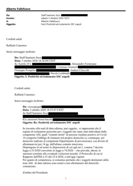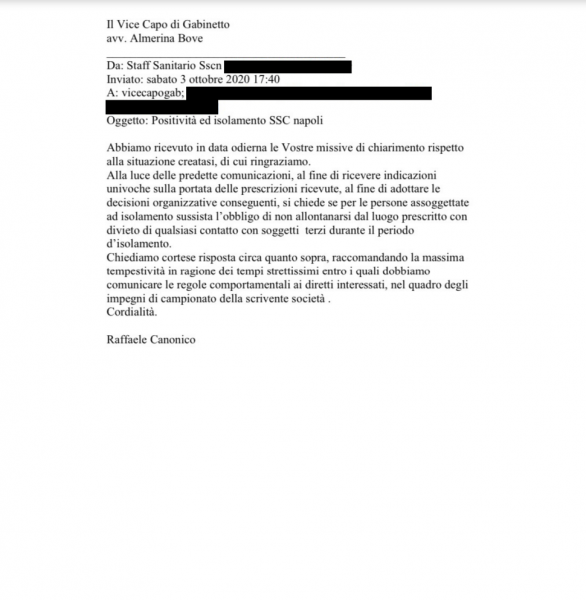 All’aeroporto di Capodichino c’è un volo che attende il Napoli per il breve viaggio a Torino. Per stabilire se partire o restare in sede, alle 17:40, il dottor Raffaele Canonico, medico sociale degli azzurri, cerca un parere definitivo dalle Asl di Napoli e dal vicecapo di gabinetto della Regione Campania: “Si chiede se per le persone assoggettate a isolamento sussista l’obbligo di non allontanarsi dal luogo prescritto con divieto di qualsiasi contatto con soggetti terzi”.