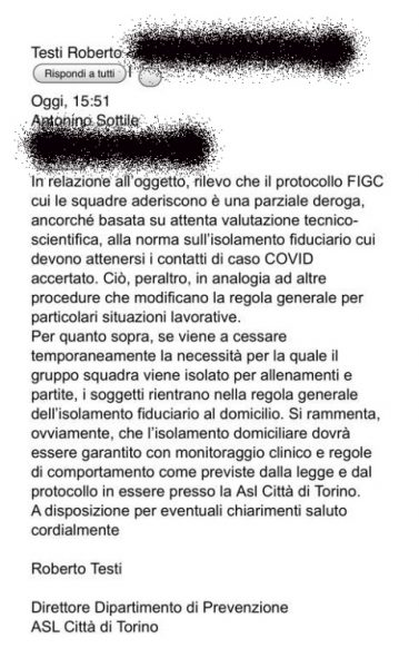 Anche la Juventus, che sabato ha scoperto due positivi fra lo staff, manda una mail all’Asl di Torino. “Rilevo che il protocollo Figc, cui le squadre aderiscono, è una parziale deroga, ancorché basata su attenta valutazione tecnico-scientifica, alla norma sull’isolamento fiduciario cui devono attenersi i contatti di caso Covid accertato. Ciò peraltro in analogia ad altre procedure che modificano la regola generale per particolari situazioni lavorative”, firmato dottor Roberto Testi, direttore del Dipartimento di prevenzione.
