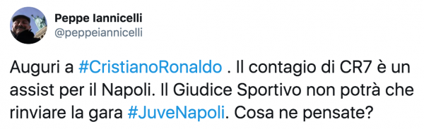 Tra gli altri, anche il noto giornalista Peppe Iannicelli ha riportato la notizia sul proprio account di Twitter, alludendo al possibile condizionamento che la positività del fuoriclasse portoghese avrà sulla decisione del Giudice Sportivo in merito al rinvio di Juventus-Napoli.