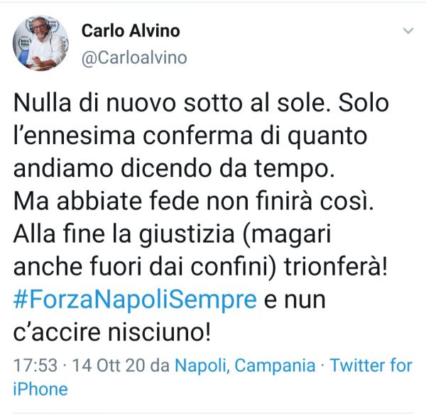 In seguito alla notizia, non sono mancati i commenti sui social, infatti, anche il giornalista Carlo Alvino ha commentato la decisione del giudice sportivo su Twitter, ecco quanto riportato: “Nulla di nuovo sotto al sole. Solo l’ennesima conferma di quanto andiamo dicendo da tempo. Ma abbiate fede non finirà così. Alla fine la giustizia (magari anche fuori dai confini) trionferà! Forza Napoli Sempre e nun c’accir nisciuno!”.
