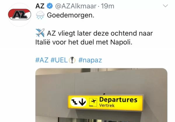 “Buongiorno. L’AZ volerà in Italia questa mattina per la partita con il Napoli. #AZ #UEL #napaz“.