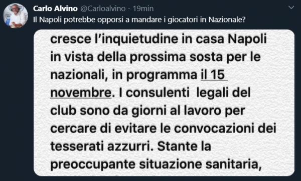 Carlo Alvino, collega di Radio Kiss Kiss Napoli, tramite il proprio profilo Twitter, commenta l’imminente arrivo della pausa per le Nazionali, rivelando un possibile blocco delle partenze da parte del Napoli per limitare i rischi di contagio da Coronavirus. Ecco quanto dichiarato: