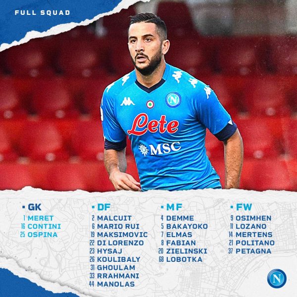 I convocati: Meret, Ospina, Contini, Di Lorenzo, Ghoulam, Hysaj, Koulibaly, Malcuit, Maksimovic, Manolas, Rrahmani, Mario Rui, Demme, Elmas, Lobotka, Fabian Ruiz, Zielinski, Bakayoko, Lozano, Mertens, Osimhen, Petagna, Politano.
