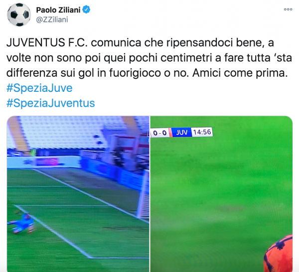 Ecco quanto scritto: “JUVENTUS F.C. comunica che ripensandoci bene, a volte non sono poi quei pochi centimetri a fare tutta ‘sta differenza sui gol in fuorigioco o no. Amici come prima“.