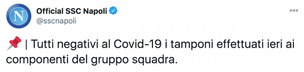 Come comunicato dal club partenopeo su Twitter, i tamponi effettuati ieri al gruppo squadra hanno dato tutti esito negativo.
