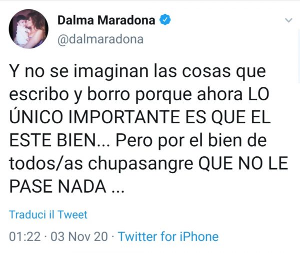 Dopo la notizia del ricovero di Diego Armando Maradona in clinica a La Plata, sono emerse anche notizie del tutto infondate. A tal proposito è intervenuta la figlia, Dalma, che ha manifestato il suo pensiero tramite il suo account ufficiale di Twitter. Ecco quanto riportato: