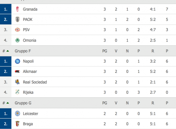 Il Napoli sta riuscendo a rimediare al passo falso alla prima giornata di Europa League contro l’AZ. Grazie alla vittoria contro la Real Sociedad di settimana scorsa e gli altri tre punti guadagnati stasera contro il Rijeka, gli azzurri si trovano a sei punti, a pari merito con AZ e Real Sociedad.