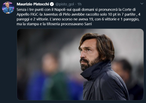 “Senza i tre punti con il Napoli, sui quali domani si pronuncerà la Corte di Appello FIGC, la Juventus di Pirlo avrebbe raccolto solo 10 pt in 7 partite, 4 pareggi e 2 vittorie. L’anno scorso ne aveva 19, con 6 vittorie e 1 pareggio, ma la stampa e la tifoseria processavano Sarri“.
