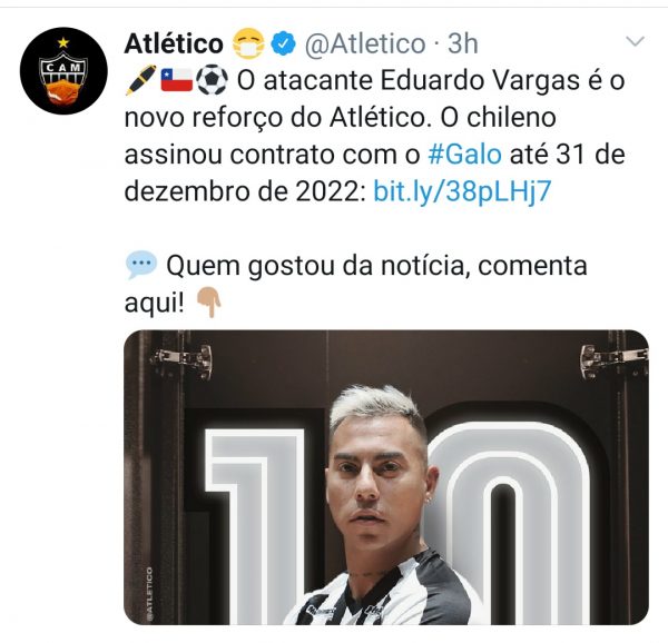 Dopo il club messicano Tigres, l’ex Napoli Eduardo Vargas, ha firmato per l’Atletico Mineiro fino al 31 dicembre 2021. A dare l’ufficialità è stato proprio il club brasiliano attraverso l’account ufficiale di Twitter, che scrive: