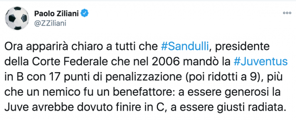 Ecco quanto scritto: “Ora apparirà chiaro a tutti che #Sandulli, presidente della Corte Federale che nel 2006 mandò la #Juventus in B con 17 punti di penalizzazione (poi ridotti a 9), più che un nemico fu un benefattore: a essere generosi la Juve avrebbe dovuto finire in C, a essere giusti radiata.