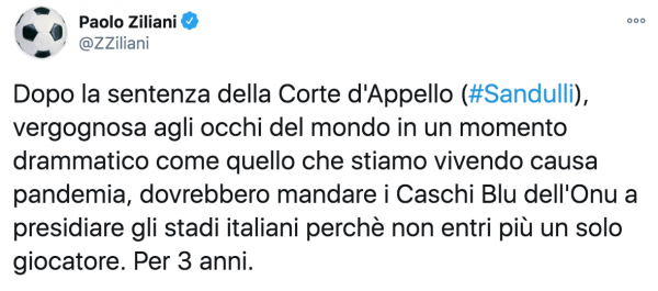 Dopo la sentenza della Corte d’Appello (#Sandulli), vergognosa agli occhi del mondo in un momento drammatico come quello che stiamo vivendo causa pandemia, dovrebbero mandare i Caschi Blu dell’Onu a presidiare gli stadi italiani perchè non entri più un solo giocatore. Per 3 anni”.