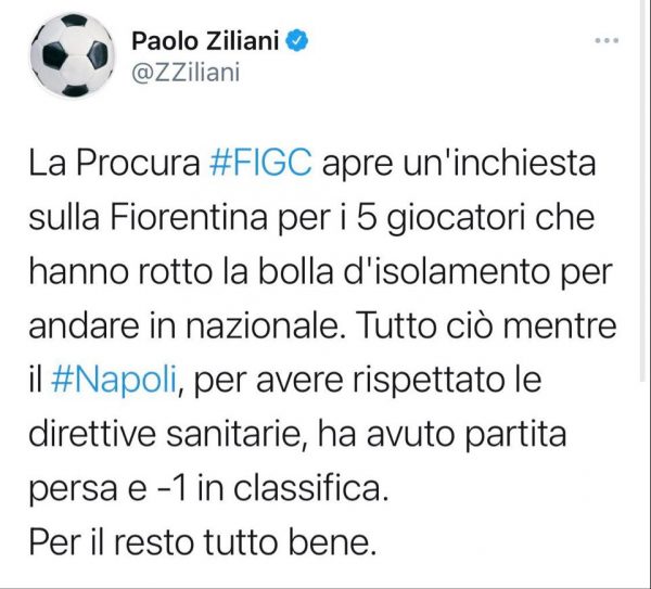 “La Procura FIGC apre un’inchiesta sulla Fiorentina per i 5 giocatori che hanno rotto la bolla d’isolamento per andare in nazionale. Tutto ciò mentre il Napoli, per avere rispettato le direttive sanitarie, ha avuto partita persa e -1 in classifica. Per il resto tutto bene”.