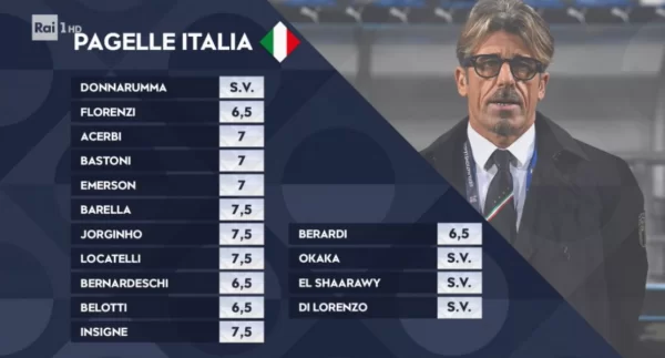 Insigne ha infatti giocato una gran partita, risultando il fulcro del gioco offensivo dell’Italia. Oltre all’assist per il raddoppio di Berardi, infatti, c’è da annoverare una rete annullata e vari tentativi del numero 10. Rai Sport ha deciso di nominare il capitano del Napoli migliore in campo, assegnandogli 7,5 in pagella a fine partita.
