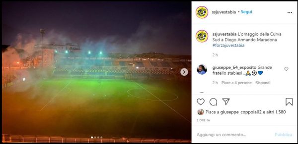 Infatti, i supporter degli stabiesi, come riporta l’account ufficiale della società di Instagram, hanno omaggiato il Pibe de Oro in Curva Sud con cori e fumogeni: “L’omaggio della Curva Sud a Diego Armando Maradona #forzajuvestabia“.