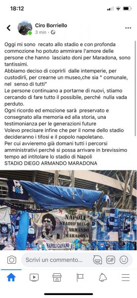 “Oggi mi sono recato allo stadio e con profonda commozione ho potuto ammirare l’amore delle persone che hanno lasciato doni per Maradona, sono tantissimi. Abbiamo deciso di coprirli dalle intemperie, per custodirli, per crearne un museo, che sia ‘comunale, nel senso di tutti’.