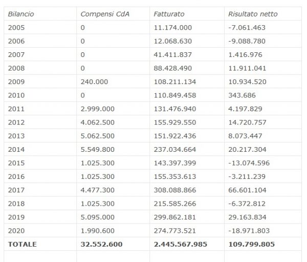 Complessivamente, i compensi al Cda hanno avuto nell’era De Laurentiis un peso sul fatturato (2,4 miliardi dal 2005 al 2020) pari all’1,3% e un peso sul risultato netto (109,8 milioni dal 2005 al 2020) pari a circa il 30%.