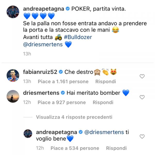 Dries Mertens ha poi commentato “Hai meritato Bomber!”. Pronta la risposta del bulldozer azzurro: “Ti voglio bene”.