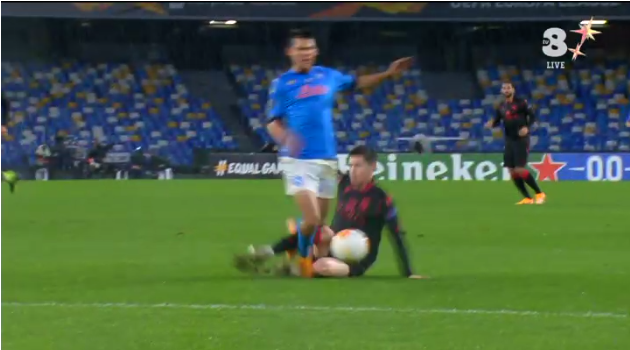 Il fallo è evidente e da rosso, visto che è chiara occasione da rete, ma l’arbitro concede solo calcio d’angolo. Non c’è il VAR nei gironi di Europa League quindi non è stato possibile fare un silent check. Viene ammonito, invece, Mertens per proteste.