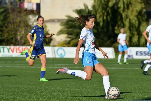 Marino ha schierato dal via le ultime due straniere arrivate in azzurro, vale a dire Arnadottir in difesa e Rjisdjik centravanti. Modulo 4-3-3 con Cafferata laterale basso per l’infortunio di Cameron e Di Criscio recuperata in extremis ma poi costretta ad uscire anzitempo. Nel Verona, causa Covid, appena 17 calciatrici in distinta. Modulo 3-5-2 con Bragonzi punta avanzata. Meglio le ospiti in avvio con il Napoli che appariva un po’ contratto forse per l’importanza della posta in palio. Poche emozioni nella prima mezz’ora, con solo un paio di uscite buone dei due portieri (Perez su cross di Colombo e Durante su Popadinova). Al 31’ vantaggio ospite con Bragonzi che scappa sulla linea del fuorigioco, salta Arnadottir con un pizzico di fortuna e trova l’angolo basso in diagonale. Reazione Napoli con un colpo di testa di Beil da ottima posizione sul quale è miracolosa la deviazione con la mano aperta di Durante. Sempre Beil, appena prima dell’intervallo, sfiora il bersaglio grosso dal limite mentre Durante si oppone a Popadinova nel recupero, ma si torna negli spogliatoi con il Verona avanti.