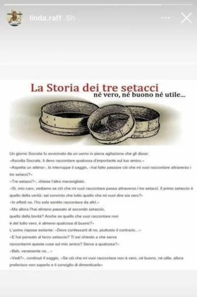 ‘Sì mio caro, vediamo se ciò che mi vuoi raccontare passa attraverso i tre setacci. Il primo setaccio è quello della verità: sei convinto che tutto quello che mi vuoi dire sia vero?’.
