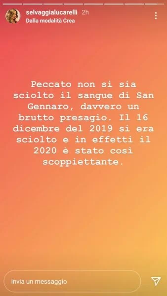 “Peccato non si sia sciolto il sangue di San Gennaro, davvero un brutto presagio. Il 16 dicembre del 2019 si era sciolto e in effetti il 2020 è stato così scoppiettante“.