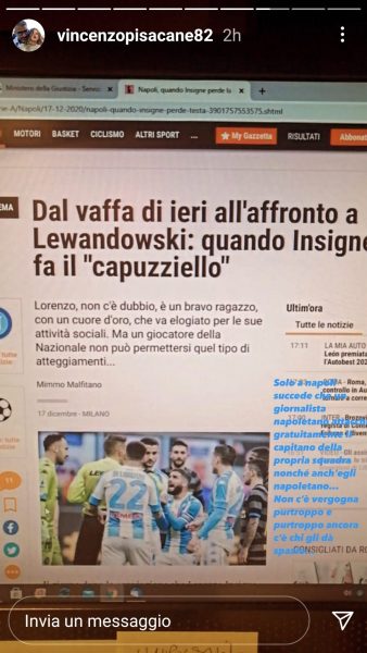 Vincenzo Pisacane, agente di Lorenzo Insigne ha commentato in modo polemico la Gazzetta dello Sport sul proprio profilo Instagram per un articolo pubblicato quest’oggi sul quotidiano che apostrofava il capitano del Napoli come ‘capuzziello‘. Ecco quanto dichiarato