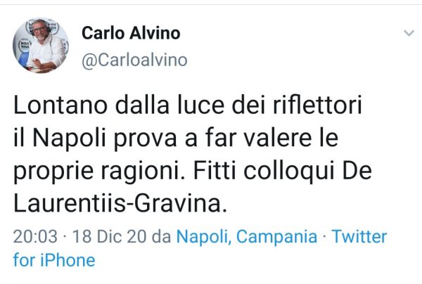Il giornalista ha scritto così su Twitter: “Lontano dalla luce dei riflettori il Napoli prova a far valere le proprie ragioni. Fitti colloqui De Laurentiis-Gravina“.