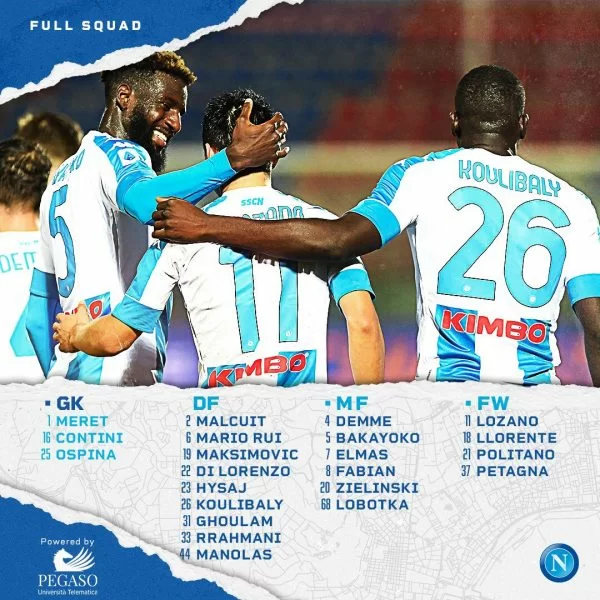 I convocati: Meret, Ospina, Contini, Di Lorenzo, Ghoulam, Hysaj, Koulibaly, Malcuit, Maksimovic, Manolas, Rrahmani, Mario Rui, Demme, Elmas, Lobotka, Fabian Ruiz, Zielinski, Bakayoko, Lozano, Petagna, Politano, Llorente.