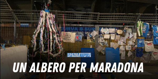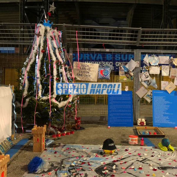 Ebbene in queste ore, come testimonia la foto scattata dalla redazione di SpazioNapoli, è stato lasciato anche un albero di Natale addobbato con tanto di corona azzurra in cima. Ennesima dimostrazione d’affetto del popolo partenopeo nei confronti del Pibe de Oro.