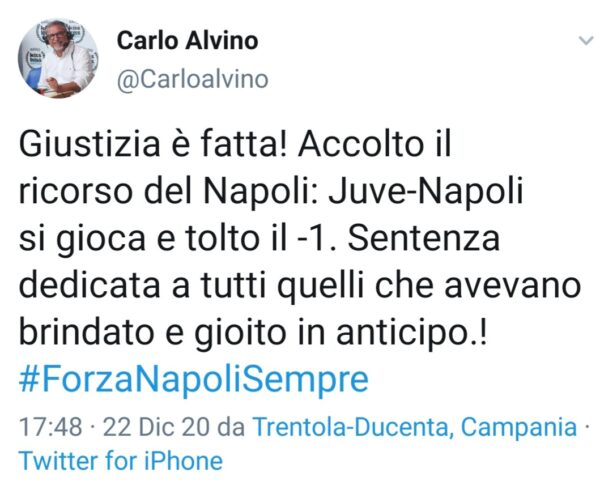 Al riguardo è intervenuto il giornalista napoletano, Carlo Alvino, che tramite Twitter esprime così una sua considerazione: “Giustizia è fatta! Accolto il ricorso del Napoli: Juve-Napoli si gioca e tolto il -1. Sentenza dedicata a tutti quelli che avevano brindato e gioito in anticipo.!”.