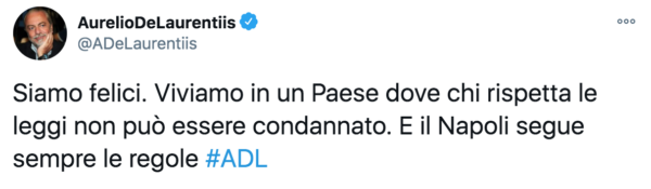 “Siamo felici. Viviamo in un Paese dove chi rispetta le leggi non può essere condannato. E il Napoli segue sempre le regole #ADL”.