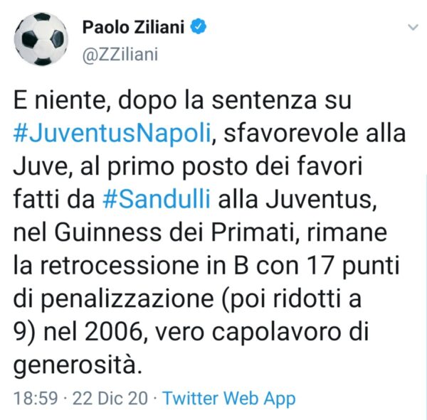 L’ex calciatore italiano esprime parole un po’ dure riguardo la decisione stabilita nell’ultimo grado di giudizio e, su Twitter, scrive: “E niente, dopo la sentenza su Juventus-Napoli, sfavorevole alla Juve, al primo posto dei favori fatti da Sandulli alla Juventus, nel Guinness dei Primati, rimane la retrocessione in B con 17 punti di penalizzazione (poi ridotti a 9) nel 2006, vero capolavoro di generosità”.