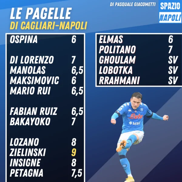 PAGELLE CAGLIARI NAPOLI – È terminato da pochi istanti il match tra Cagliari e Napoli, con gli azzurri che hanno aperto il 2021 nel migliore dei modi, vincendo in trasferta alla Sardegna Arena con il punteggio di 1-4. Mattatore assoluto della serata Piotr Zielinski con due gol fantastici, Molto positiva la prova di Lozano che segna un gol e causa l’espulsione di Lykogiannis. Da segnalare anche l’ottima prestazione di Lorenzo Insigne, impreziosita dal gol su rigore.
