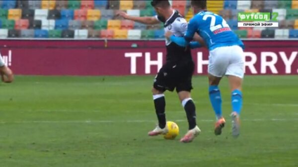 Al 38′ minuto del primo tempo di Udinese-Napoli, Di Lorenzo ha dovuto effettuare un fallo tattico su Arslan che era ripartito in contropiede.