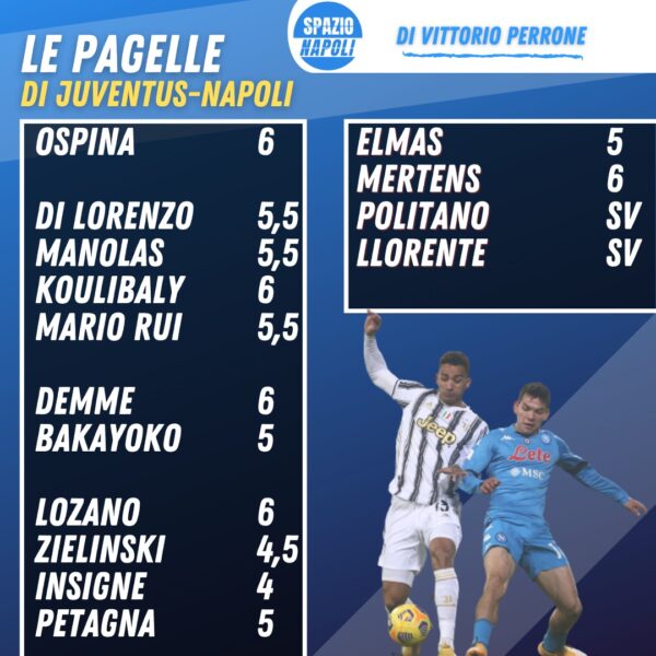 Lozano 6: Come sempre ormai l’unico a salvarsi nel reparto offensivo azzurro. Prova tante volte a impensierire i difensori bianconeri ma la sorte questa sera non è dalla parte del Napoli e del messicano.