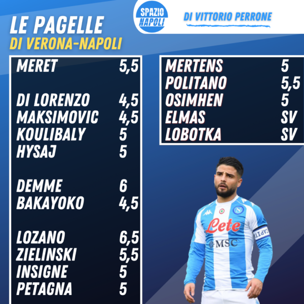 Insigne 5: vuole fare tanto per riscattare l’errore contro la Juve, vuole fare troppo forse. Tante buone intenzioni, pochissima sostanza. Dal 60º Mertens 5: entra per regalare il vantaggio al Napoli, invece perde palla e spalanca le porte al 3-1 del Verona.