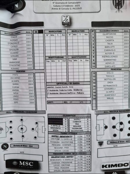 59′- Sostituzione tra le file del Napoli: esce Ambrosino con il numero 9 ed entra Furina con il numero 16.
