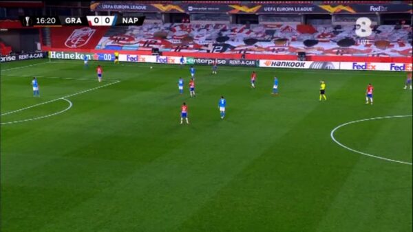Si sta disputando Granada-Napoli e c’è qualche problema riguardo il terreno da gioco. In alcune zone del campo qualche giocatore è scivolato più di una volta.