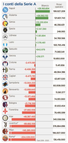 Dario Di Gennaro, giornalista di Rai Sport, ha mostrato sul suo profilo Twitter i bilanci delle società di Serie A. Situazione aggravata dalla crisi dovuta al Covid, ma il quadro è impressionante: solo otto squadre in positivo. Il Napoli è la società più virtuosa, con un utile di circa 30 milioni; poco dietro l’Atalanta con 26.