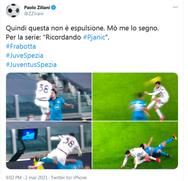 Paolo Ziliani, giornalista de Il Fatto Quotidiano, ha commentato così su Twitter il fallo che è costato l’ammonizione a Gianluca Frabotta in Juventus-Spezia: