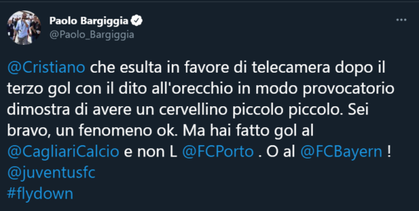 Tweet polemico di Paolo Bargiggia contro Cristiano Ronaldo, reo di aver esultato in maniera provocatoria dopo la tripletta al Cagliari. Questo il commento di Bargiggia su Twitter: “Cristiano che esulta in favore di telecamera dopo il terzo gol con il dito all’orecchio in modo provocatorio dimostra di avere un cervellino piccolo piccolo. Sei bravo, un fenomeno ok. Ma hai fatto gol al Cagliari non al Porto. O al Bayern!“