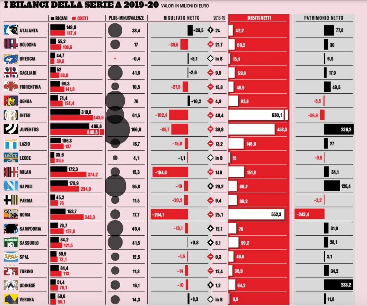 “L’Atalanta è il club messo meglio, grazie al ciclo continuo di valorizzazione dei talenti e ai premi Champions delle ultime due partecipazioni: sta per essere festeggiato il quinto bilancio di fila in utile con l’esercizio al 31 dicembre 2020. Ok pure Cagliari e Verona.