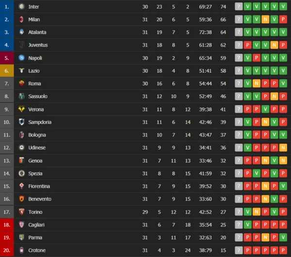 Con le vittorie del pomeriggio, l’Atalanta raggiunge il terzo posto in classifica scavalcando la Juve e mettendosi a +5 dal Napoli. La Lazio invece si avvicina agli azzurri raggiungendo i 58 punti ad una sola lunghezza dagli azzurri.