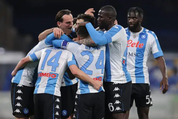 Dries Mertens of SSC Napoli celebrates with team mates after scoring the goal of 4-0 during the Serie A football match between SSC Napoli and SS Lazio at Diego Armando Maradona Stadium in Napoli Italy, April 22th 2021. Photo Cesare Purini / Insidefoto cesarexpurini