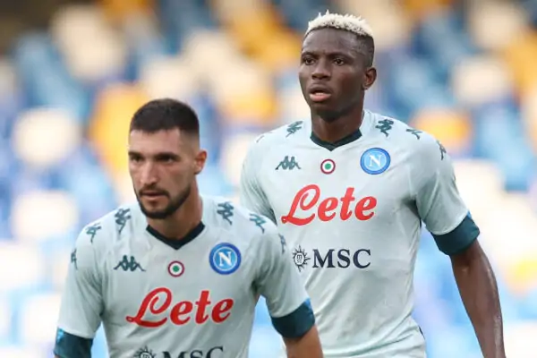 Victor Osimhen of SSC Napoli and Matteo Politano during the friendly football match between SSC Napoli and Pescara Calcio 1936 at stadio San Paolo in Napoli, Italy, September 11, 2020. Photo Cesare Purini / Insidefoto CesarexPurini