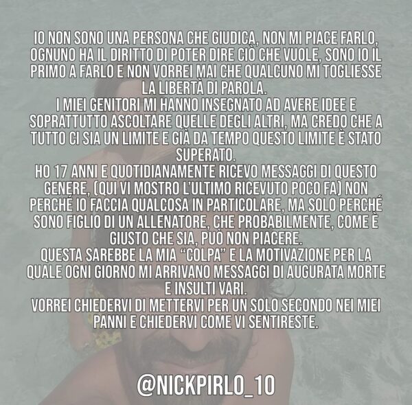 Nicolò Pirlo è il figlio dell’allenatore della Juventus. Alcuni “pseudotifosi” lo stanno bersagliando da settimane con insulti di vario genere e l’augurio di morire. Il ragazzo, che ha solo 17 anni, ha reso nota la situazione sul suo profilo Instagram, scrivendo un lungo messaggio in cui denuncia l’accaduto, dovuto alla sua presunta “colpa” di essere semplicemente figlio di Andrea Pirlo.