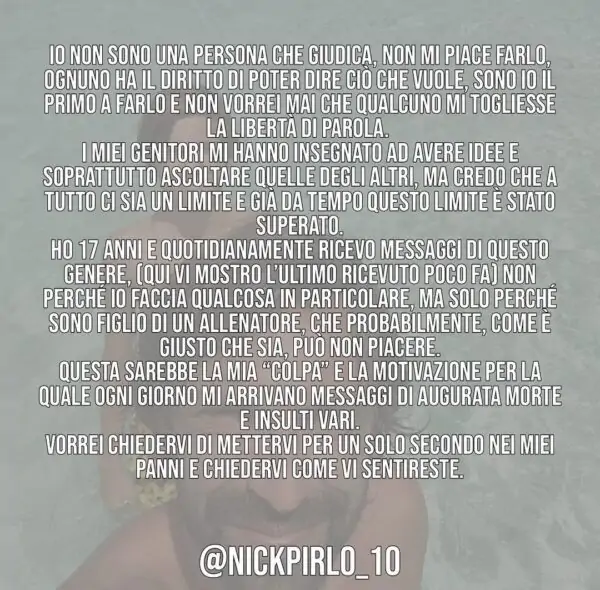 Nicolò Pirlo è il figlio dell’allenatore della Juventus. Alcuni “pseudotifosi” lo stanno bersagliando da settimane con insulti di vario genere e l’augurio di morire. Il ragazzo, che ha solo 17 anni, ha reso nota la situazione sul suo profilo Instagram, scrivendo un lungo messaggio in cui denuncia l’accaduto, dovuto alla sua presunta “colpa” di essere semplicemente figlio di Andrea Pirlo.