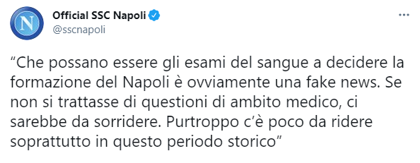 “Che possano essere gli esami del sangue a decidere la formazione del Napoli è ovviamente una fake news. Se non si trattasse di questioni di ambito medico, ci sarebbe da sorridere. Purtroppo c’è poco da ridere soprattutto in questo periodo storico”.