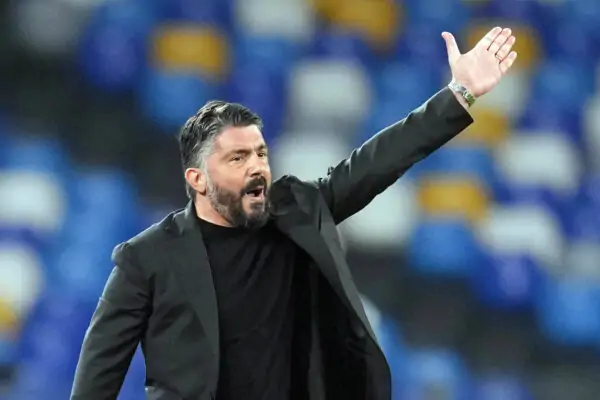 NAPLES, ITALY - APRIL 22: Gennaro Gattuso Italian coach of SSC Napoli gestures during the Serie A match between SSC Napoli and SS Lazio at Stadio Diego Armando Maradona on April 22, 2021 in Naples, Italy Copyright: xFotoagenziax