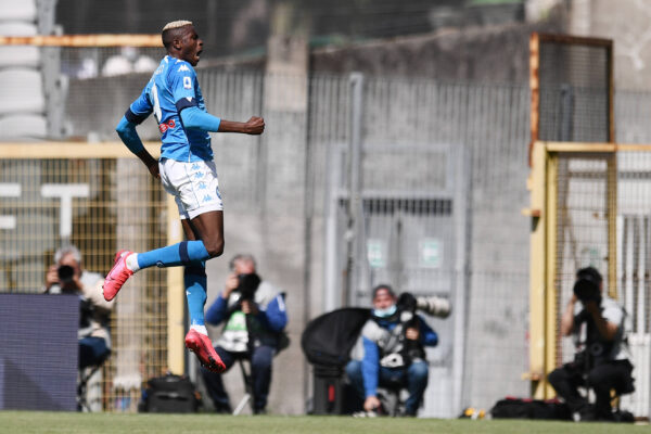 Victor Osimhen esulta dopo la doppietta realizzata allo Spezia nel 4-1 rifilato dal Napoli ai liguri.